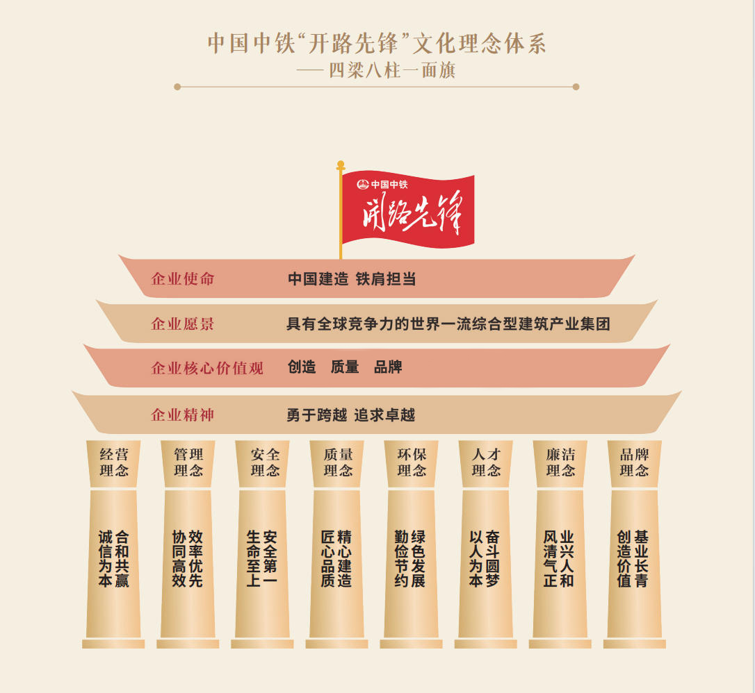 总览:“开路先锋”精神是中国中铁高尚品格和优良传统的集中概括,是中国中铁企业文化的基础与源头,是“勇于跨越 追求卓越”这一企业精神的统领与核心,伴随着企业120多年的发展历程,已深深融入中国中铁人的血脉之中。基于悠久的历史渊源和深厚的现实基础,中国中铁企业文化总称为中国中铁“开路先锋”文化。