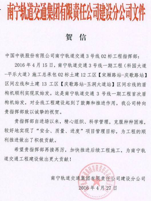 南宁轨道交通集团发来贺信
