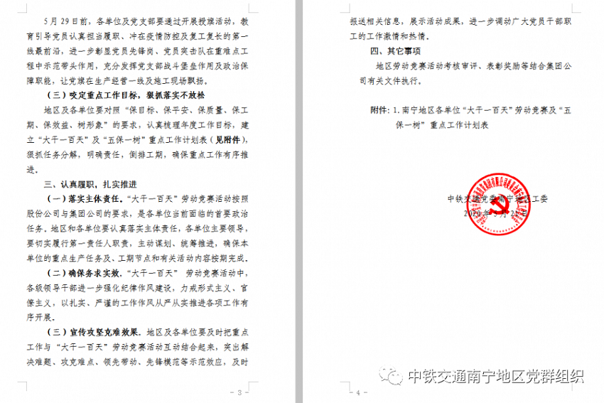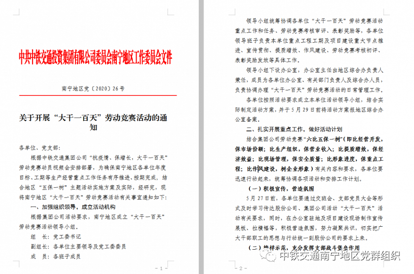 南宁地区各单位及所属项目工区分别组织召开了“抗疫情、保增长,大干100天”专项劳动竞赛动员会,深入贯彻落实股份公司、集团公司关于“抗疫情、保增长,大干100天”专项劳动竞赛动员会精神。