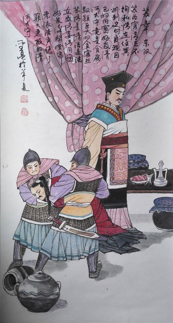 东汉刺史。苏章为官刚正廉洁,不徇私情。在任冀州刺史时,发现贪污受贿数额巨大的清河太守竟是自己情同手足的同窗好友。然苏章情归情,法是法,他在盛宴款待同窗好友后,依法办事,在公堂上将老同学拿下,依法将其治罪。